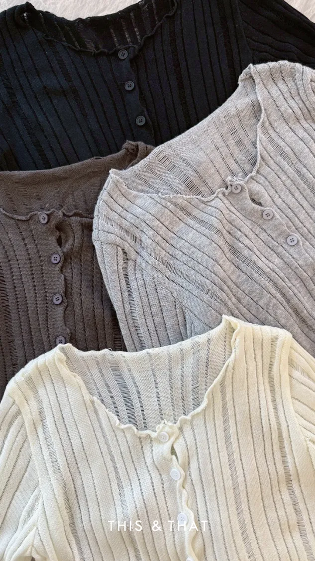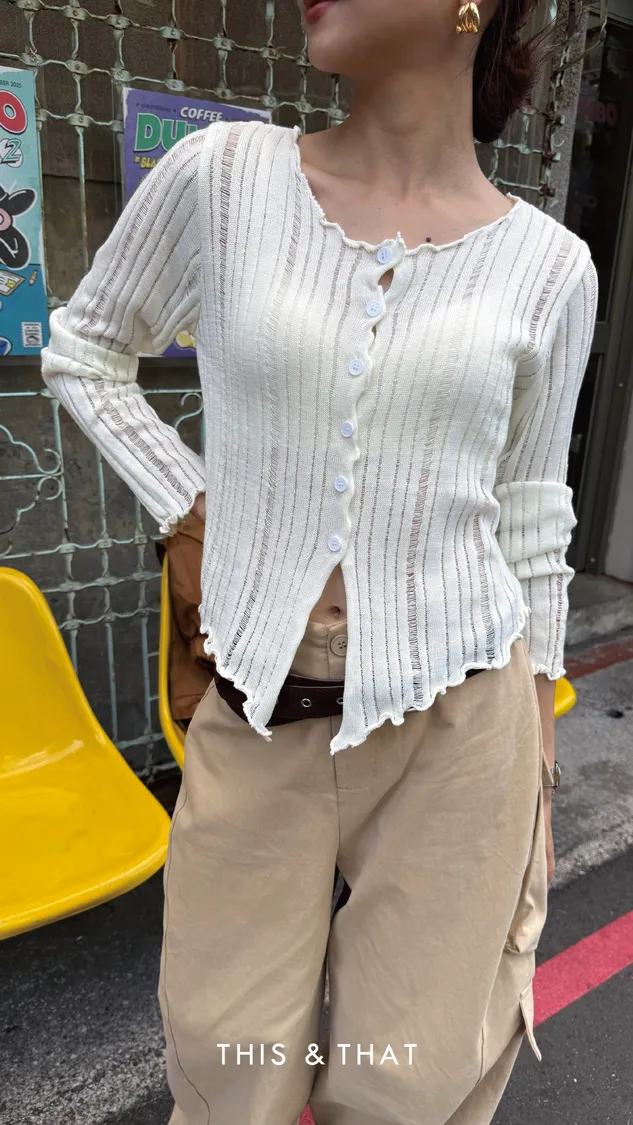 FW306 無感舒適~小心機坑條排釦木耳邊上衣 - 4色