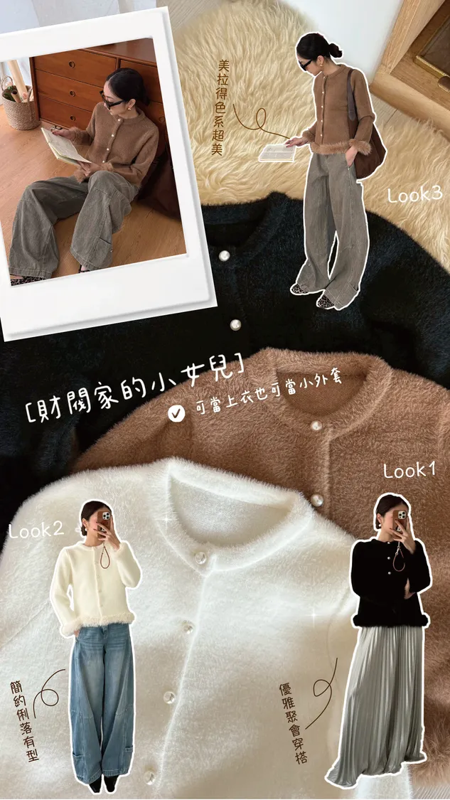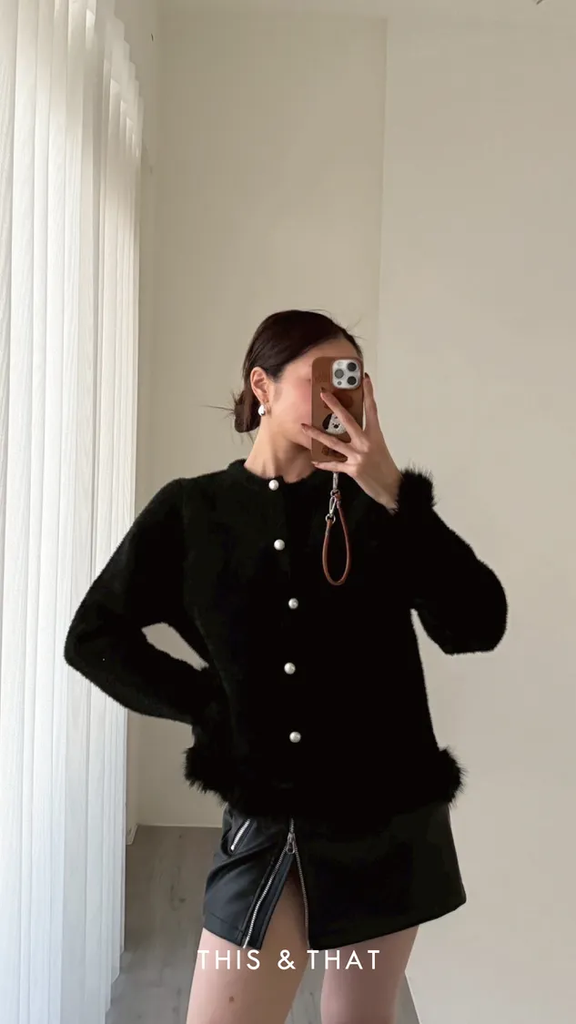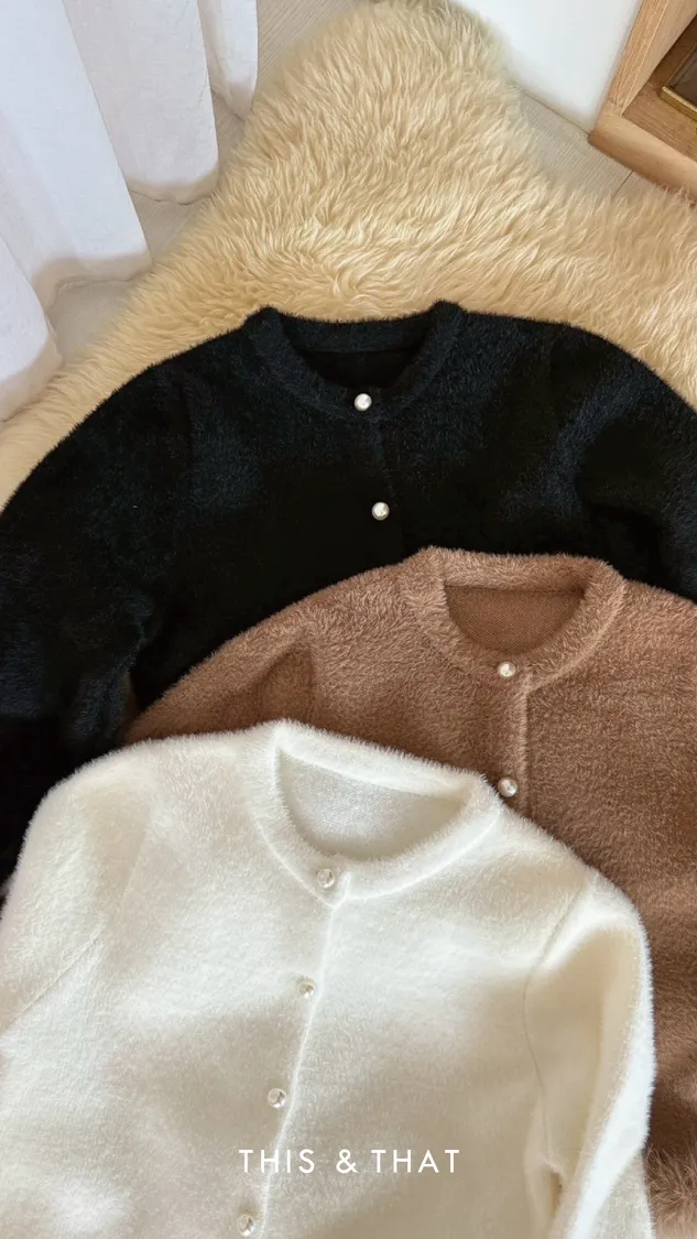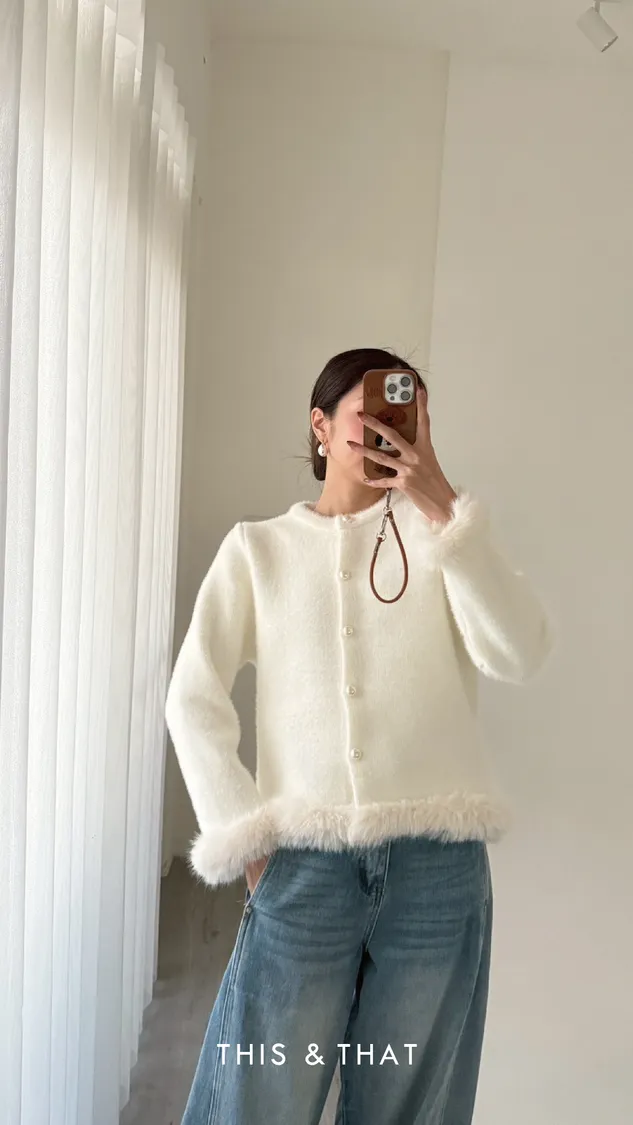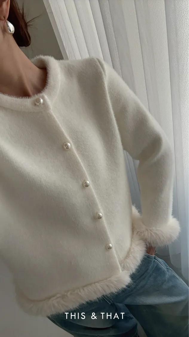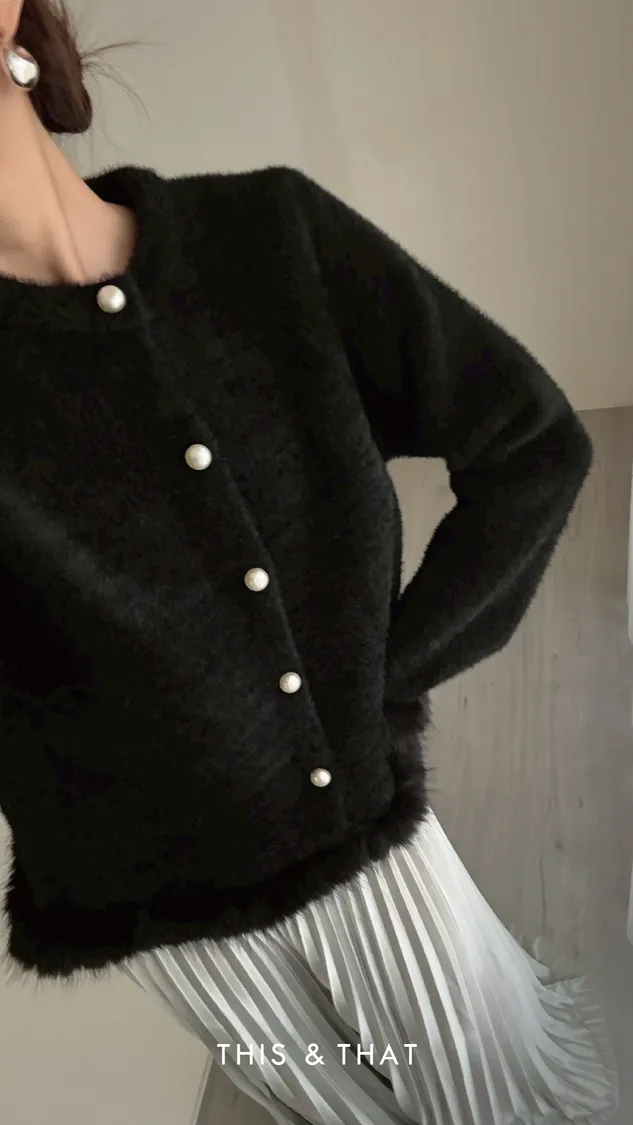 FW341 財閥家小女兒~水貂毛毛珍珠排釦開襟衫 - 3色
