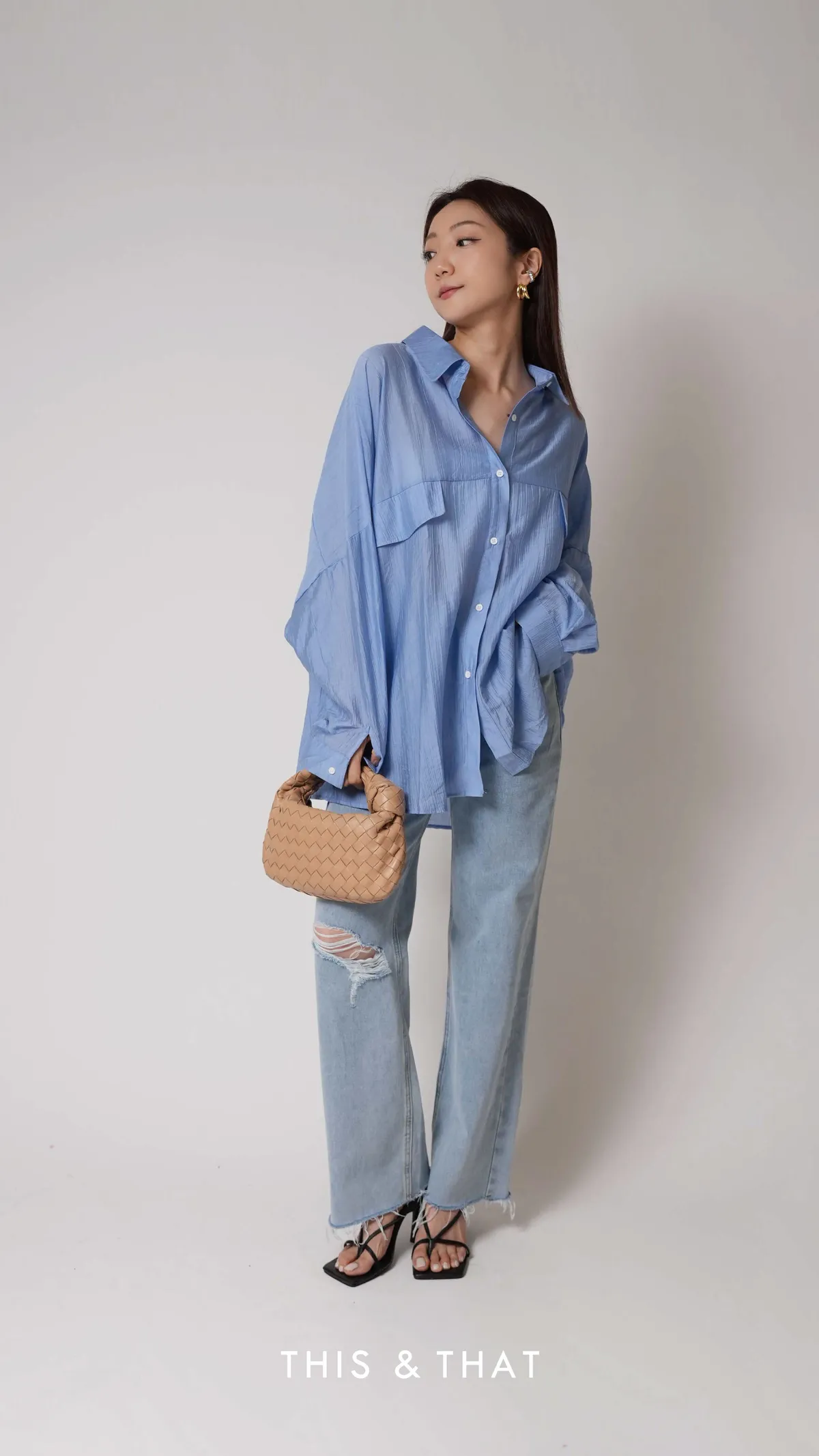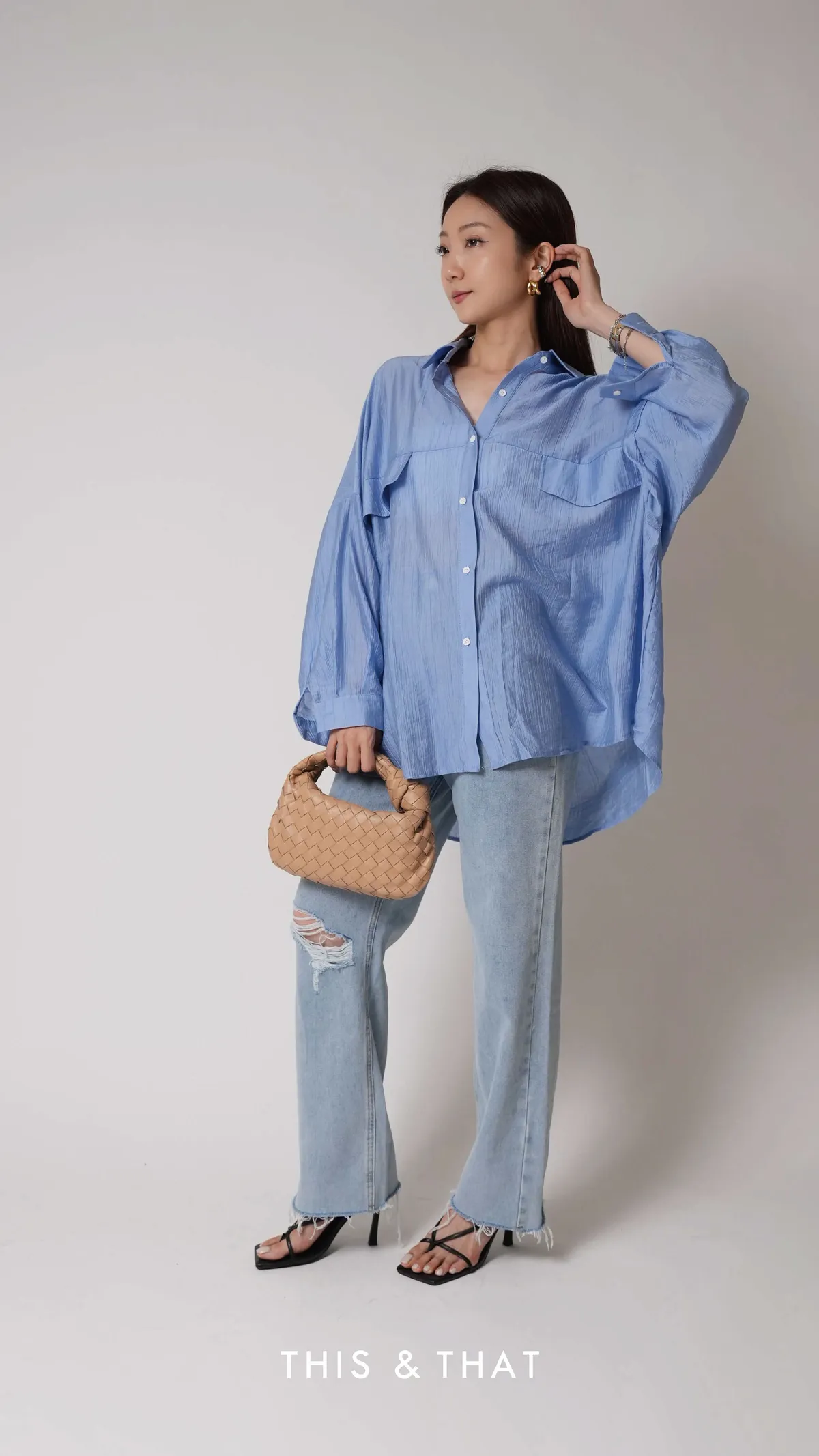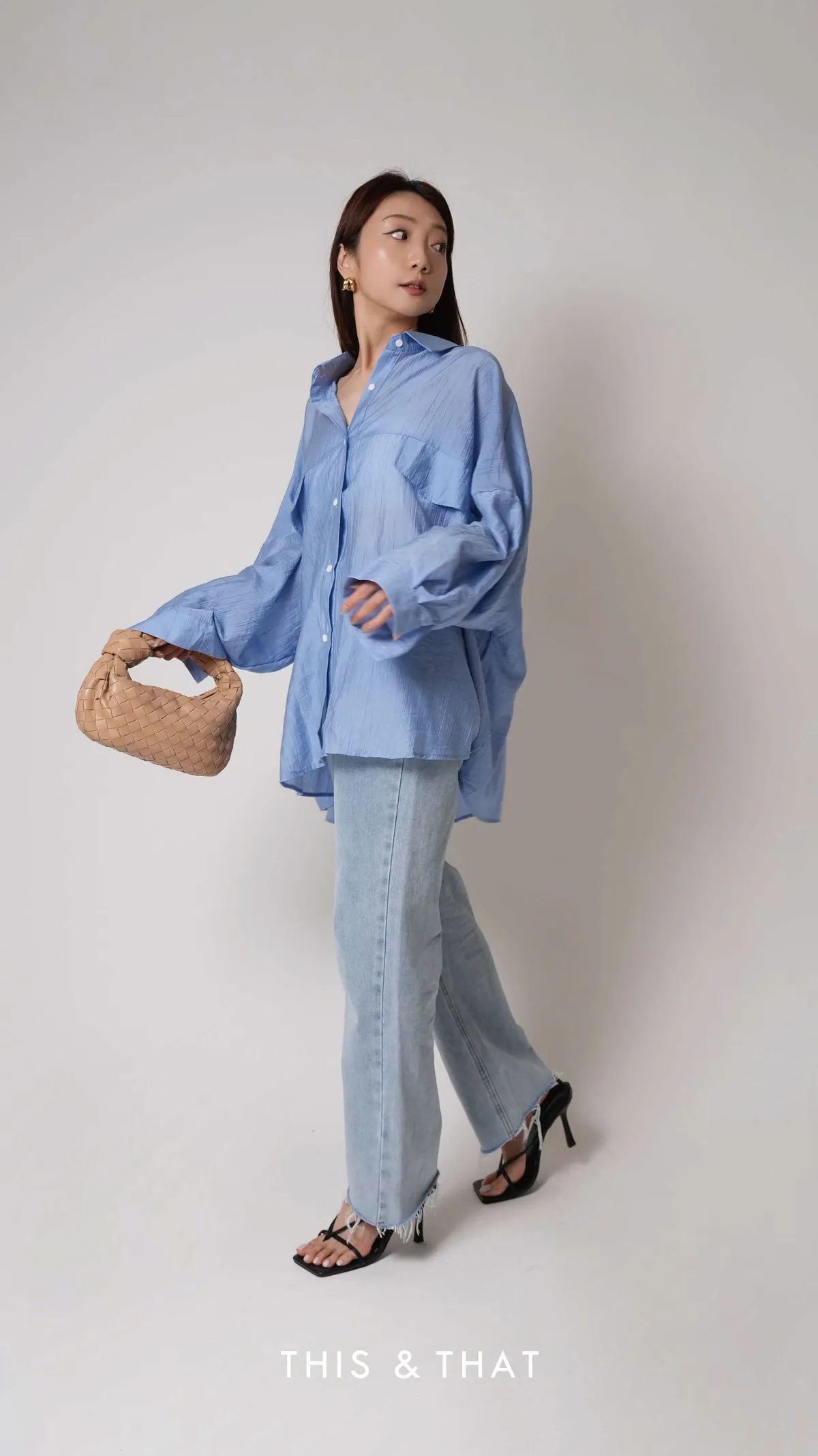 SS342 歐美KOL人手一件的藍色紋理寬版襯衫